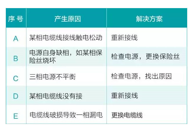 三相電機在運轉(zhuǎn)時必須由三根電纜線提供驅(qū)動電源,才能達到三相平衡運轉(zhuǎn);如果由兩根電源線提供電源也能夠運轉(zhuǎn),但運轉(zhuǎn)時間加長會導(dǎo)致電機因缺相燒毀電機。判別電機缺相方法: