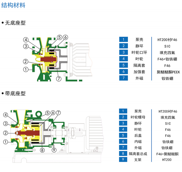 材料上:WJC-F耐腐蝕氟塑料磁力泵主軸、軸套采用間隙配合,且材質均采用自潤滑抗干磨無壓燒結碳化硅制成。泵的加強套采用碳纖維增強PEEK,無磁渦流現象,磁鐵采用稀土外磁及內磁,磁性超強且不退磁。