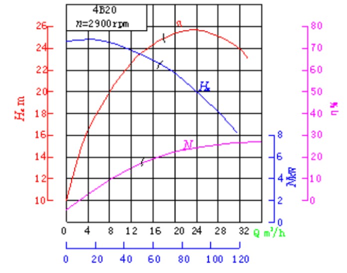 η-Q曲線表示泵的流量Q和效率η的關系。開始η隨Q的增大而增大,達到大值后,又隨Q的增大而下降。該曲線大值相當于效率高點。泵在該點所對應的壓頭和流量下操作,其效率高。所以該點為離心泵的設計點。選泵時,總是希望泵在高效率工作,因為在此條件下操作為經濟合理。但實際上泵往往不可能正好在該條件下運轉,因此,一般只能規定一個工作范圍,稱為泵的高效率區。高效率區的效率應不低于高效率的92%左右。泵在銘牌上所標明的都是高效率下的流量,壓頭和功率。離心泵產品目錄和說明書上還常常注明高效率區的流量、壓頭和功率的范圍等。